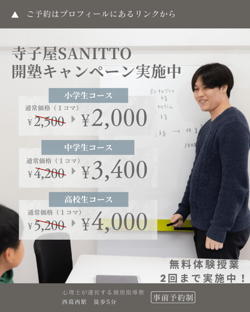 こんにちは。西葛西の個別指導塾:寺子屋SANITTOの新田です。
